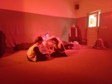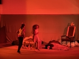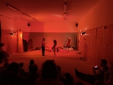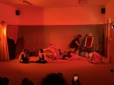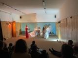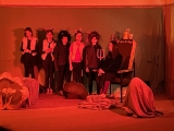 Vsadili jsme na rychlé přeměny prostor, a proto poprvé použili oponu a osvětlení, které nám půjčili loutkáři. (Tímto děkujeme panu učiteli. S. Tomanovi, za půjčení i nasvícení.)