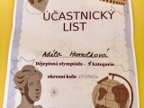 Letošní dějepisnou olympiádu provázelo téma: „Jak muž a žena kráčeli dějinami – spolu, proti sobě i vedle sebe". V konkurenci 25 žáků z celého okresu se Adéla Homolková umístila na velmi dobrém 8. místě v kategorii I., která byla určena pro žáky 7. – 9. ročníků základních škol a gymnázií.